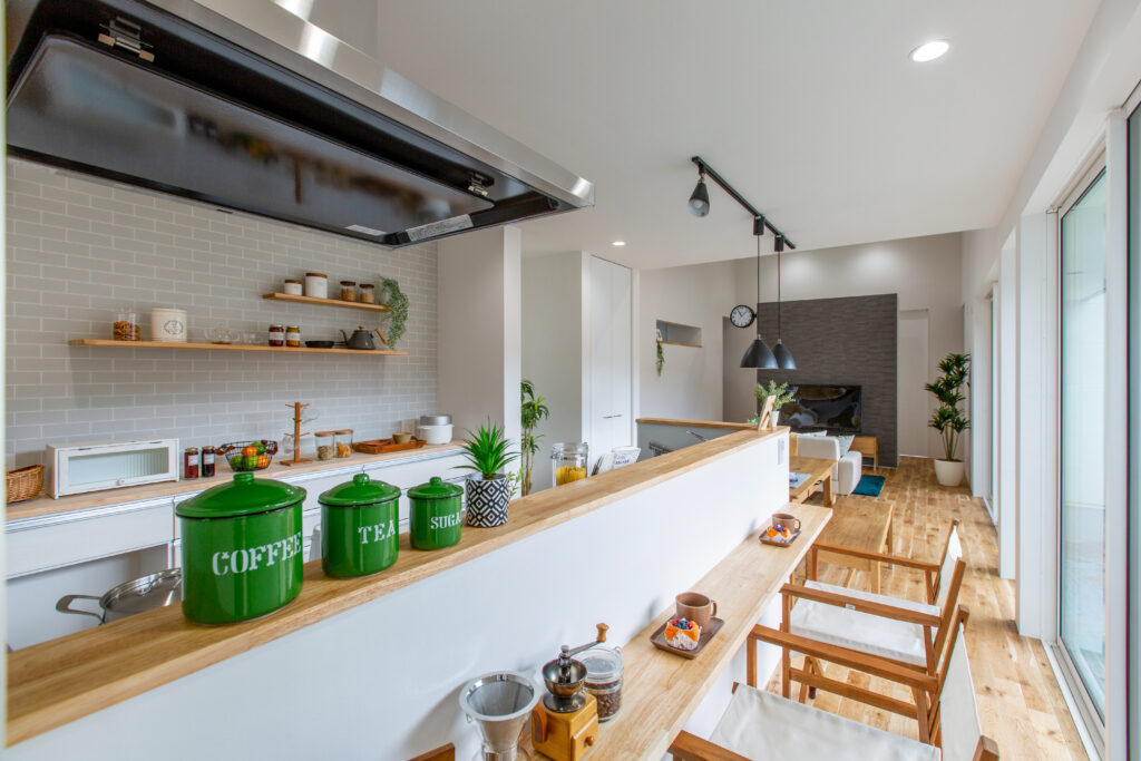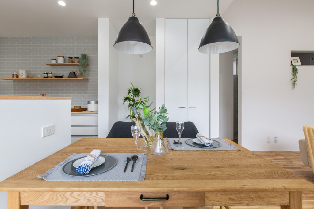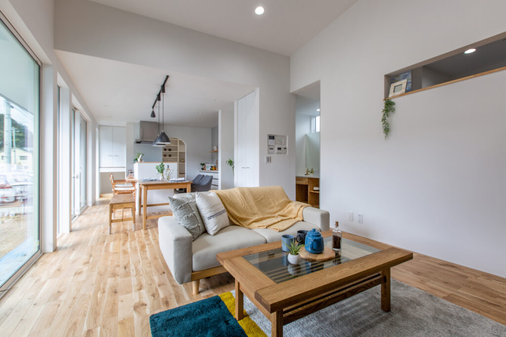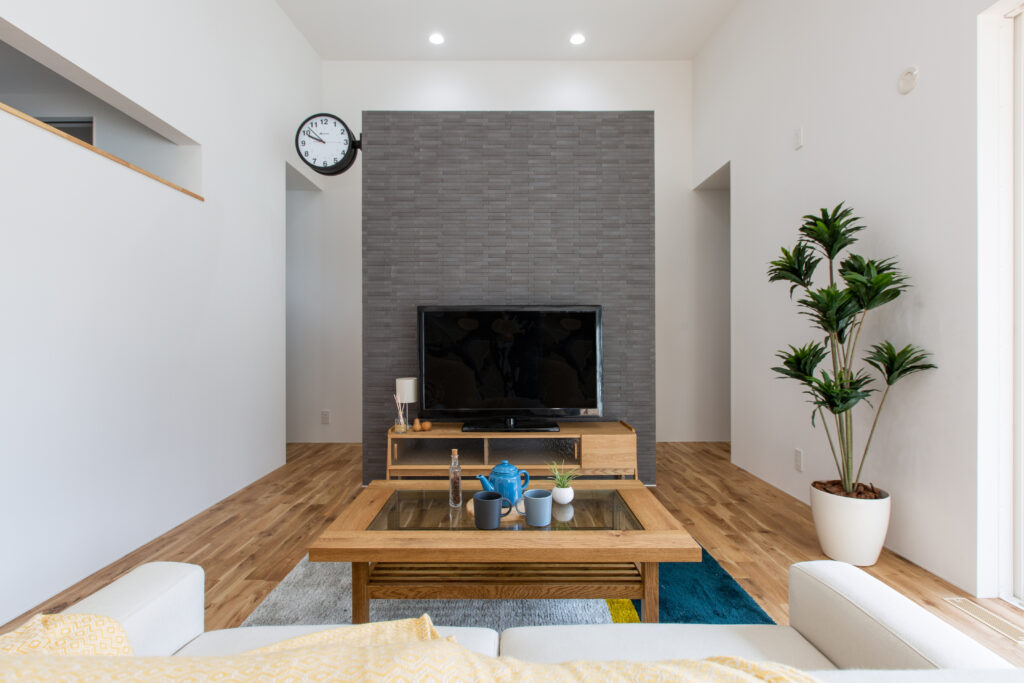家族の一員であるワンちゃんの小屋をうまく収めたLDKは、テレビ後ろの壁を活用しリビングクロークにし、
