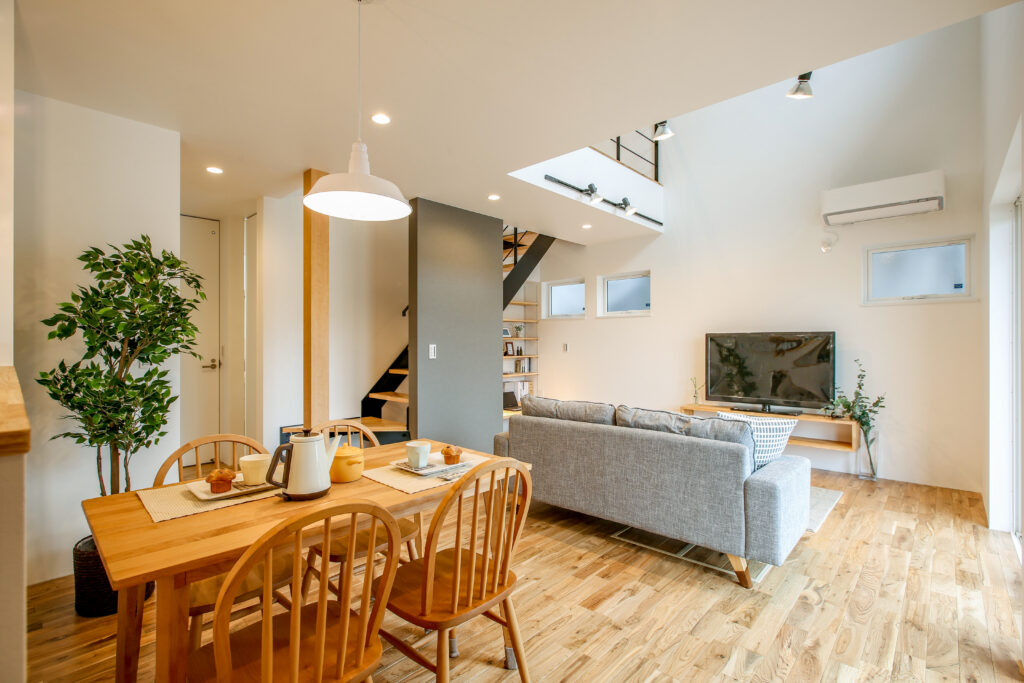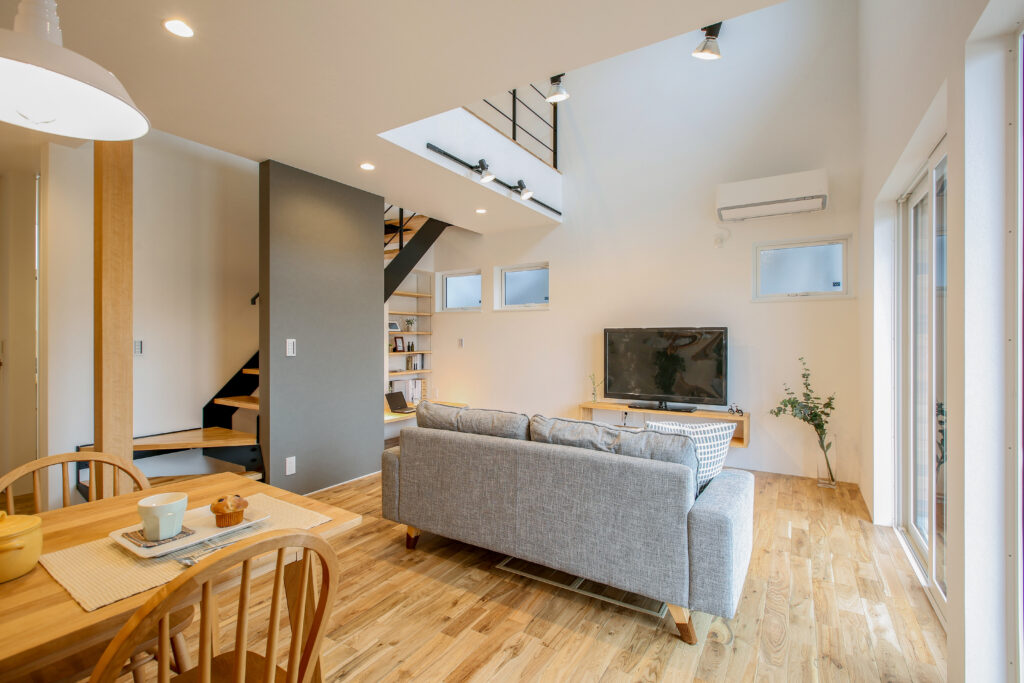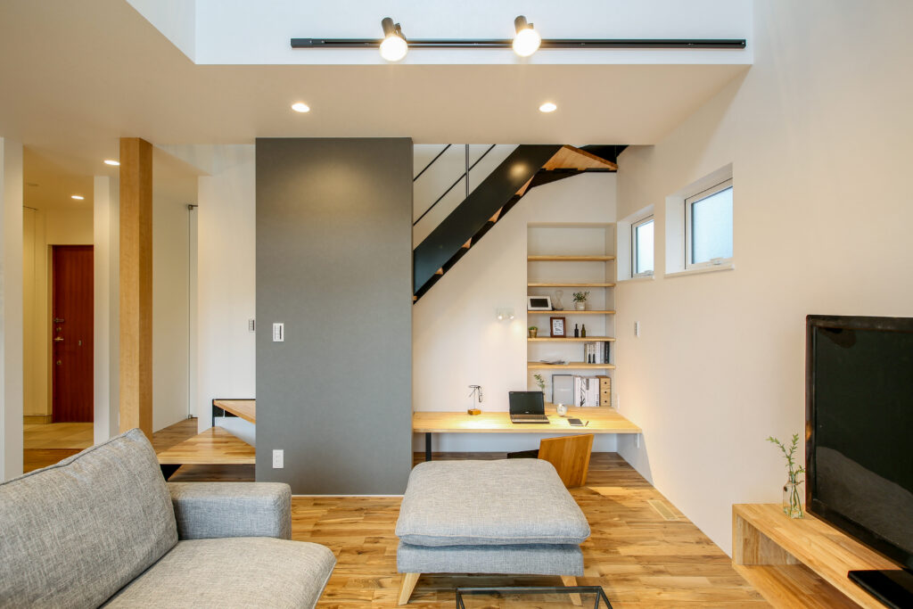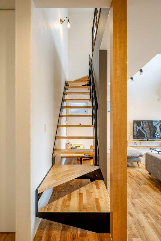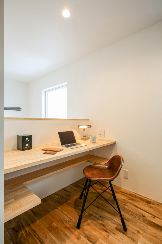 無垢をふんだに使い、子どもが素足で走り回ることができる広々空間。スペースを有効に使い、子どもが勉強できるリビングや2階の書斎など、子どもに目が届きやすい設計です。プライベートも確保しながら、子どもと過ごすことを大切に、家族が動きやすい生活導線を取り入れました。