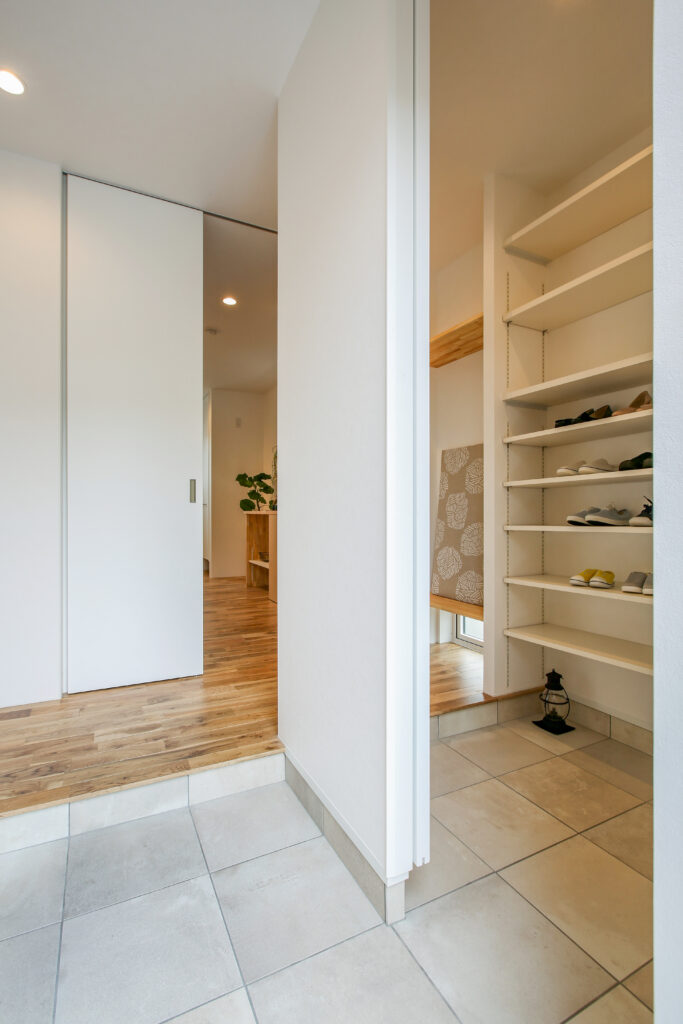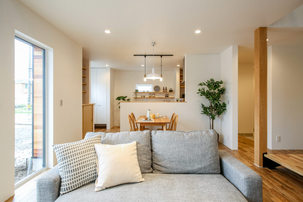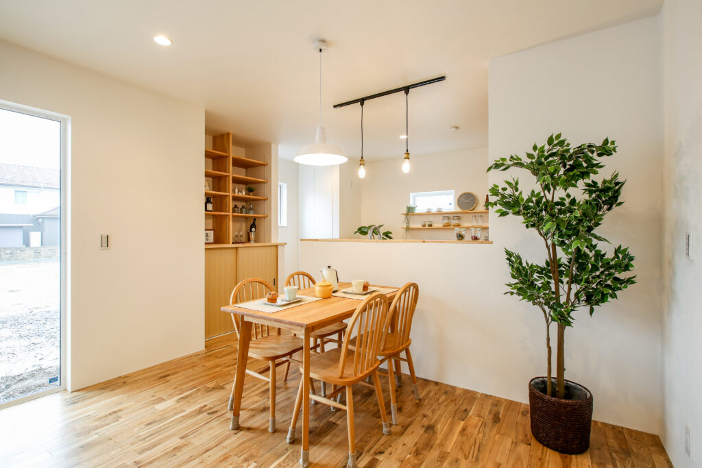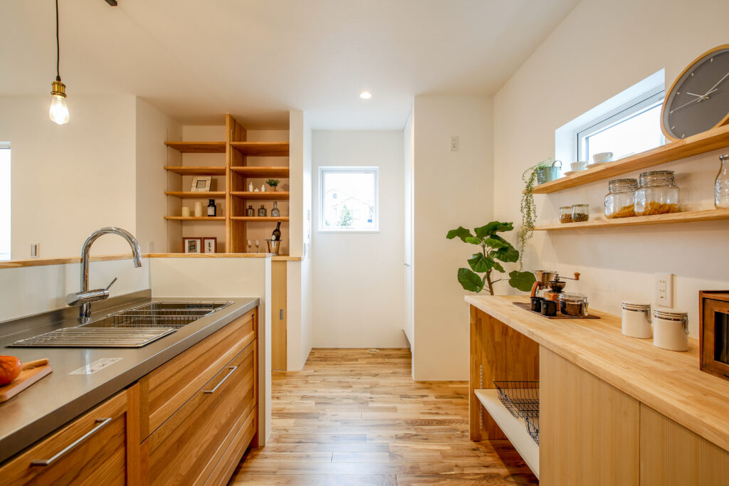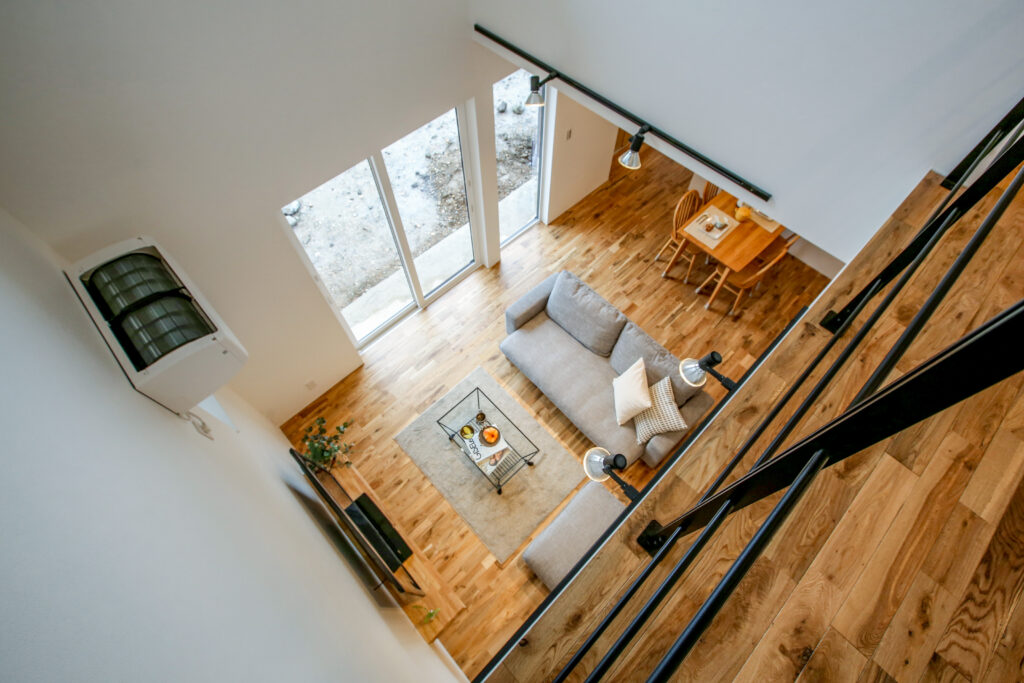 無垢をふんだに使い、子どもが素足で走り回ることができる広々空間。スペースを有効に使い、子どもが勉強できるリビングや2階の書斎など、子どもに目が届きやすい設計です。プライベートも確保しながら、子どもと過ごすことを大切に、家族が動きやすい生活導線を取り入れました。
