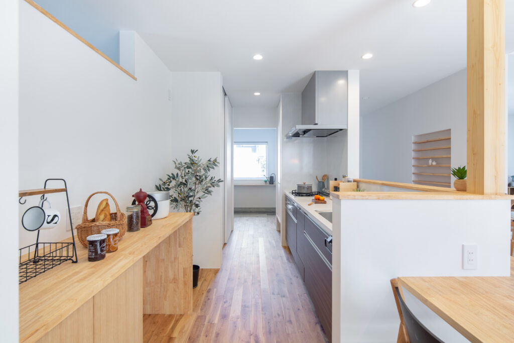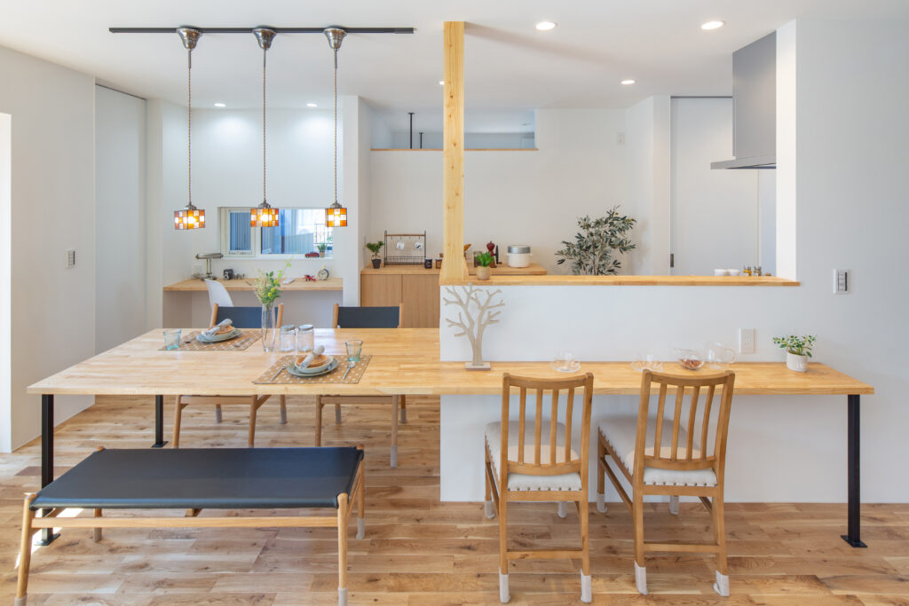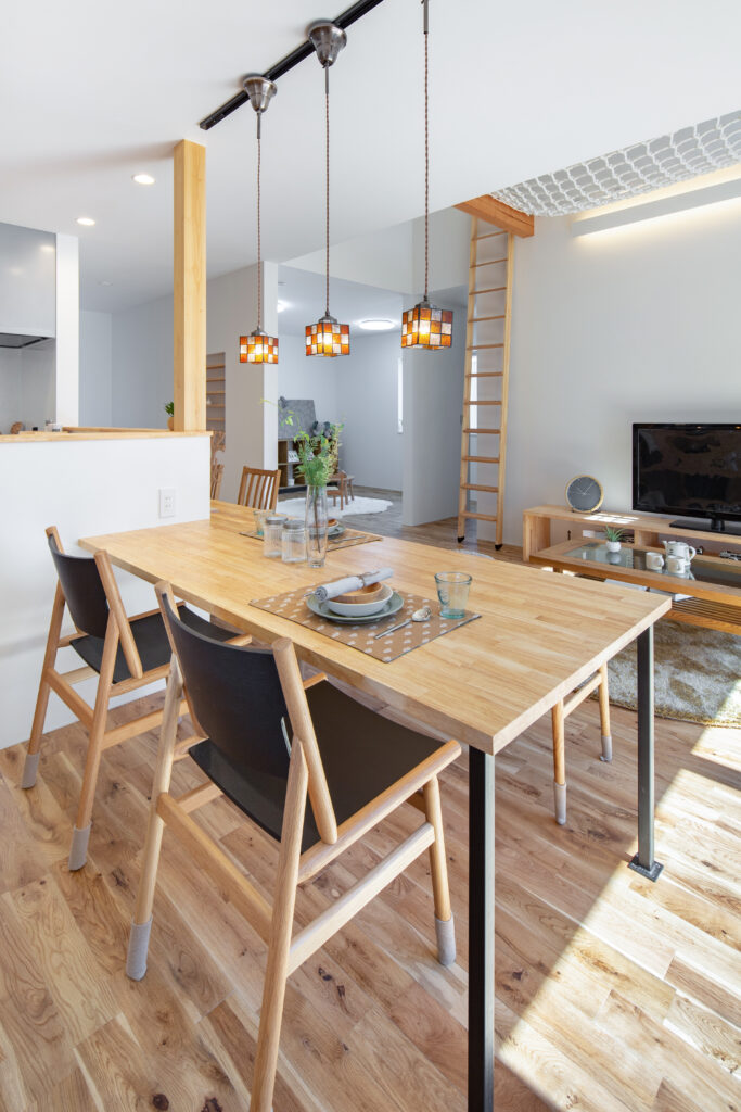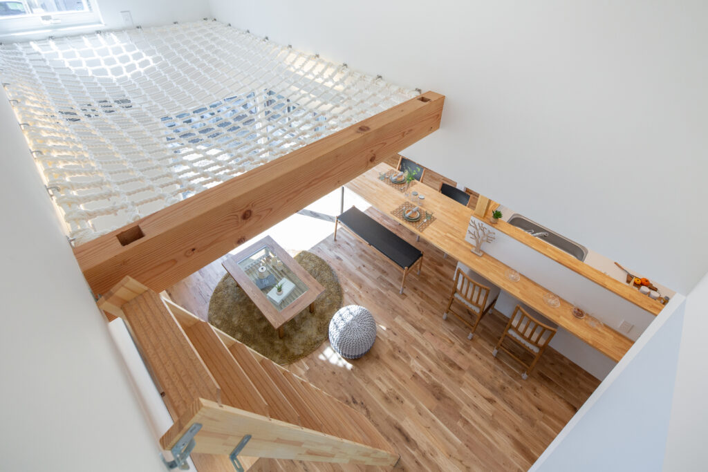 リビングの上にアスレチックネットが掛かり、ロフトから思い切りダイブ! リビングのテレビの裏には個室になる和室のワークスペース。 収納に困らないキッチンのパントリーと広いランドリールームは隣接していて家事がぐっと楽になる間取りです。