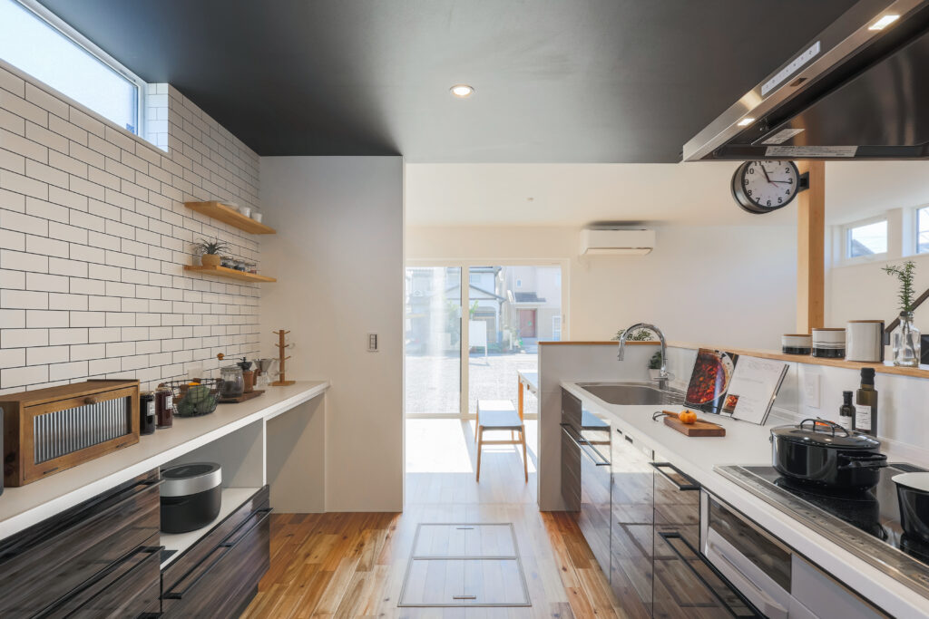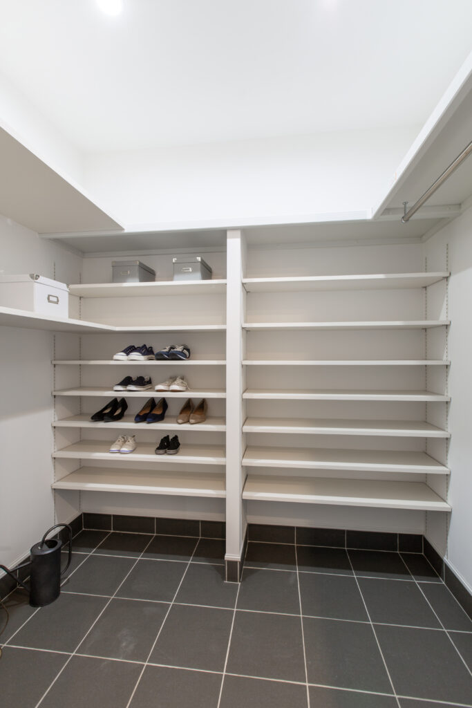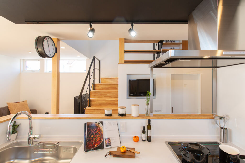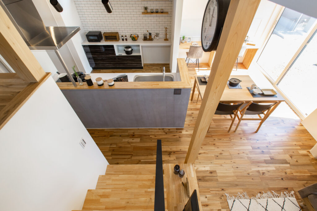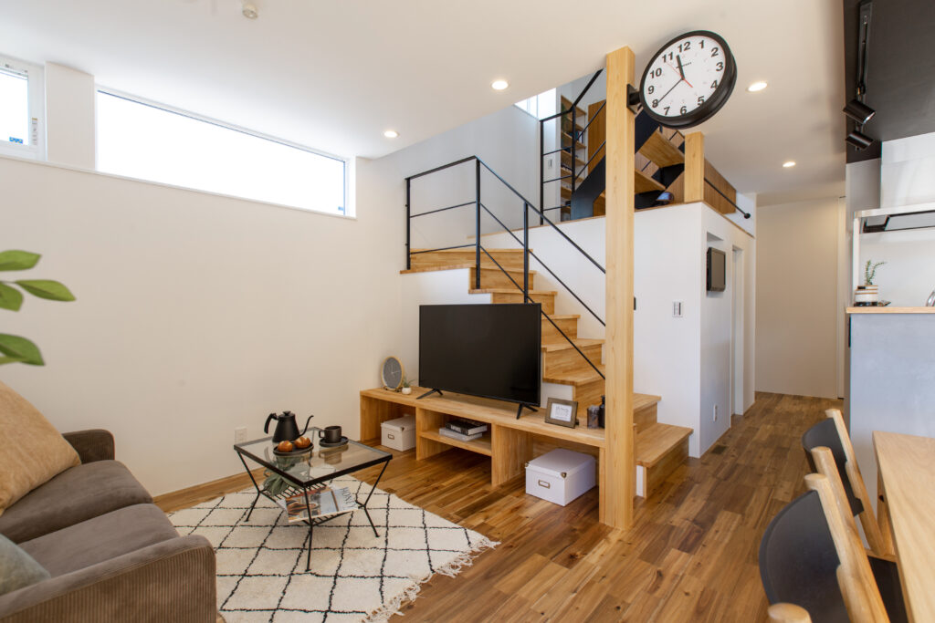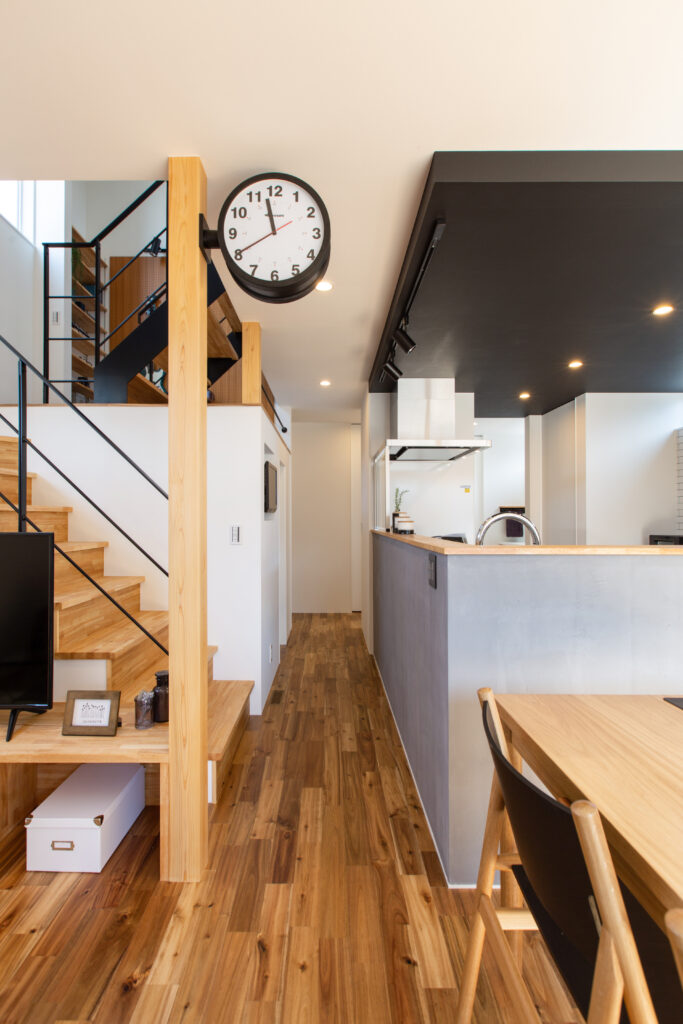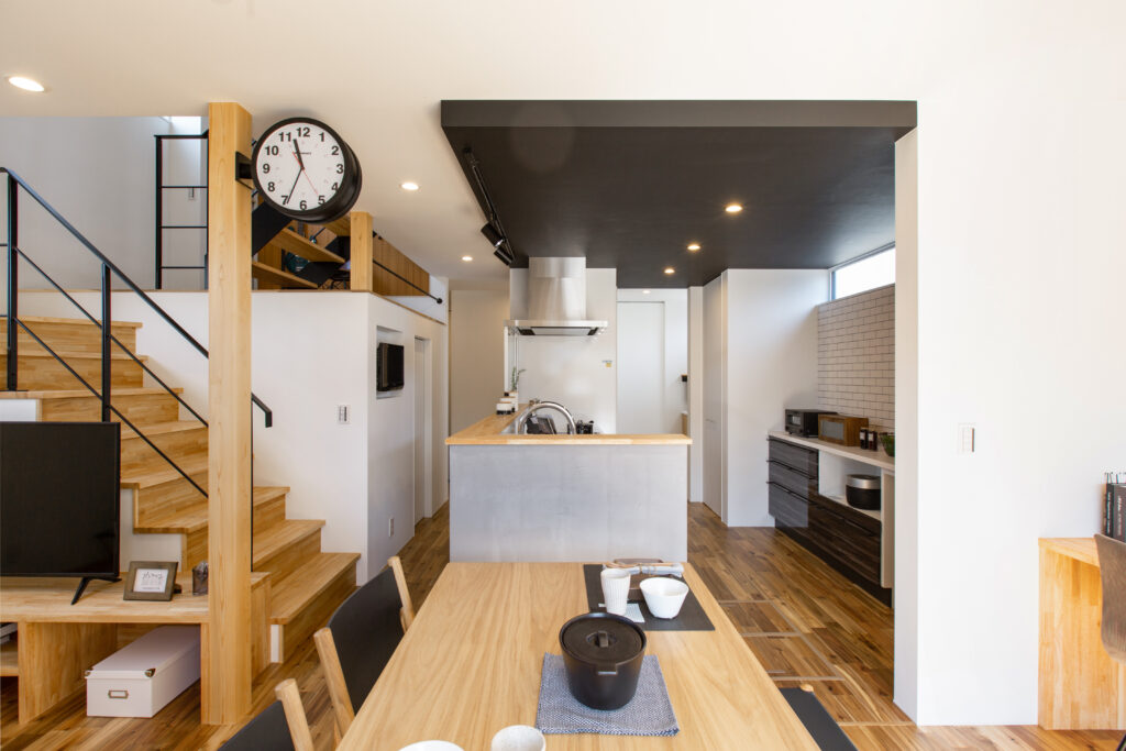 スキップフロアを取り入れることで高低差に変化が生まれ、 思い思いの過ごし方をしていても 家族の気配を感じられる空間となりました。 スキップフロア下のリビングクロークは 収納はもちろん、子供の遊び場や書斎など 生活の変化に柔軟に対応できます。