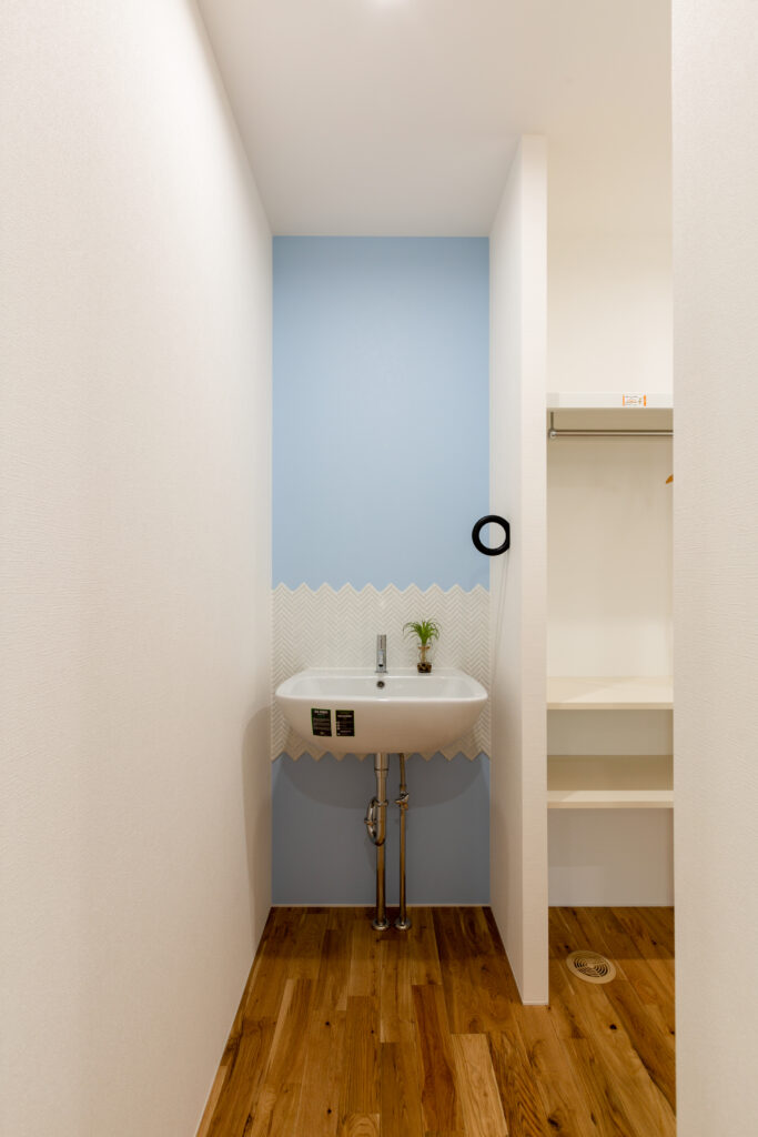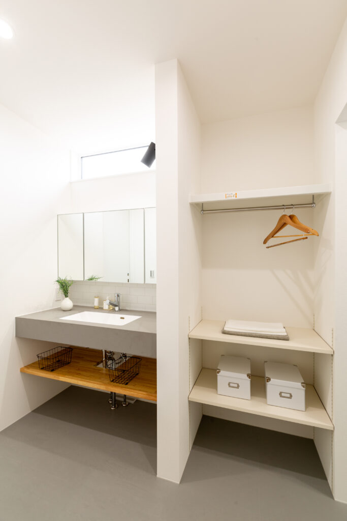 広い玄関を抜けた先にランドリールームから続く長いクローゼット。 リビングを中心に、生活感をある水回りと収納の動線をスムーズに回遊することができます。